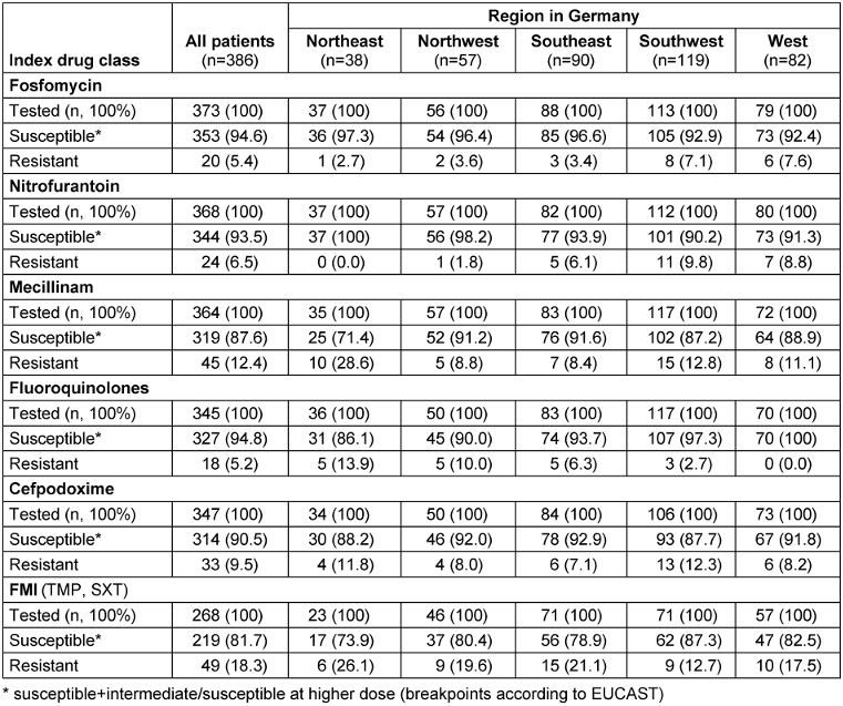 Patients were stratified into three cohorts by E. coli susceptibility to six drug classes (fosfomycin; nitrofurantoin; mecillinam; fluoroquinolones including ciprofloxacin, levofloxacin, and ofloxacin; cefpodoxime; folate metabolism inhibitors (FMIs) including trimethoprim and trimethoprim-sulfamethoxazole): susceptible to all (SUS), resistant to one or two drug classes (DR1/2), and resistant to ≥3 (MDR) drug classes tested. Among 386 eligible patients [SUS (67.1%); DR1/2 (29.0%); MDR (3.9%)], AMR prevalence was FMIs (18.3%) and lowest for fluoroquinolones (5.2%). The drugs prescribed most often were fosfomycin in SUS (44.0%), DR1/2 (41.4%), and fluoroquinolones in MDR (40.0%) (Table 3 [Tab. 3]). Between the 5 regions in Germany, one could observe some differences in the rate of resistance of more than 10% for mecillinam and the fluoroquinolones. The resistance rates for trimethoprim or cotrimoxazole were in the range around 20% (17.5%–26.1%) except in the southwest with only 12.7%, whereas in the northeast and in the southeast the resistance rates were >20% (Table 4 [Tab. 4]).