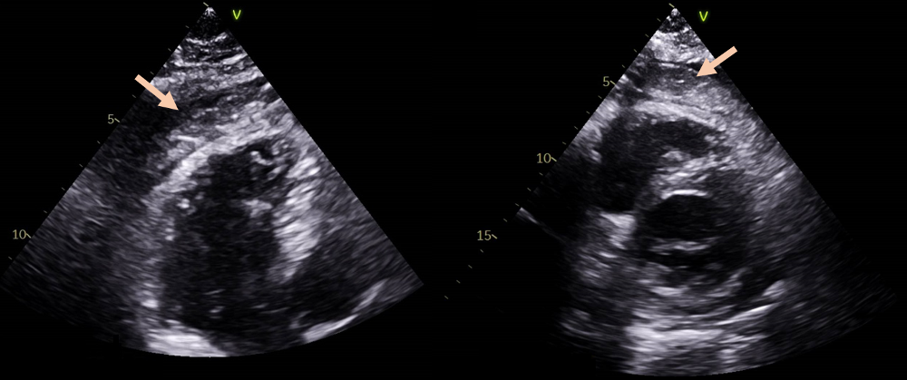 On the left: TTE image in 3 chamber view showing pericardial effusion with heterogeneous content in the pericardial space (arrow), inexistent in the TTE post pericardiocentesis; on the right: TTE image in short axis view, showing the same heterogeneous content in the pericardial space (arrow)