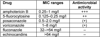 Amphotericin B is the most active agent [9]. Furthermore, synergisms between amphotericin B and various non-antifungals have been reported [21]. Flucytosine is also reliably active (Table 1 [Tab. 1]). In general, however, isolates of Rhodotorula spp. are resistant to fluconazole and only poorly susceptible to posaconazole and voriconazole [17], [18], [22], [23], [24]. Consequently, these yeasts have a chance to be selected especially in a clinical setting in patients under a longlasting therapeutic regimen with azoles, i.e. fluconazole or posaconazole [25]. Since Rhodotorula spp. belong to the basidiomycetes, which quite typically do not contain1-3-β-glucan in their cell wall, they are intrinsically resistant to echinocandins. Hence, colonizations and even breakthrough infections are also reported in patients treated with echinocandins [15].