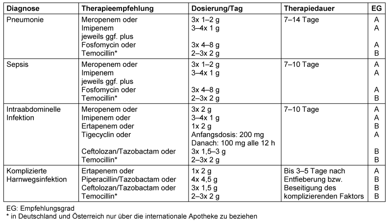 Als Therapieoptionen stehen derzeit Beta-Lactamase-Inhibitoren (Avibactam, Clavulansäure, Tazobactam) in fixer Kombination mit einem Penicillin (Amoxicillin/Clavulansäure, Piperacillin/Tazobactam) oder Cephalosporin (Ceftazidim/Avibactam, Ceftolozan/Tazobactam) sowie Temocillin, die Carbapeneme (Ertapenem, Imipenem/Cilastatin, Meropenem), Colistin, Fosfomycin und Tigecyclin zur Verfügung.
