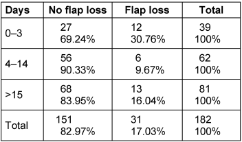 The timing of the free flap operation was also considered, depending on the time elapsed from the injury to the free flap. After oncological resection, the time of the last resection is evaluated until the day of the surgical intervention. With this consideration, soft tissue defects were divided into three temporal categories. 39 patients received free flaps within the first 72 hours, 62 patients between the 4th and 14th day and 81 patients from the 15th day onwards (Table 3 [Tab. 3]). On average, the free flap was transplanted after 19.01 days. A significant correlation was determined between the period of time elapsed until flap coverage and flap loss (p=0.022), with the best results being obtained in the group which was operated between day 4 and day 14.