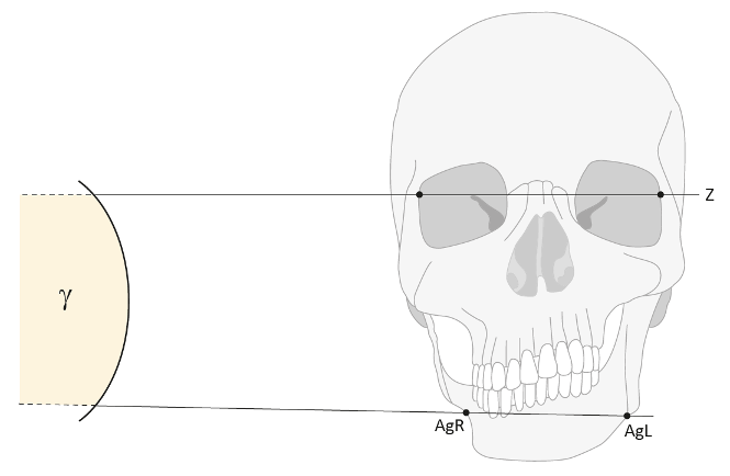 The line labeling “Z” defines a plane parallel to the horizontal. The measuring points AgR and AgL are usually not parallel to the Z plane: the angle of both distances defines gamma. In FPNF patients, Ag of the affected side frequently is more cranially situated than on the non-affected side. For didactic reasons, the drawing reproduces a significant maxillomandibular dysplasia, which causes a higher antegonion notch on the right side with a deformed mandibular ramus. The skeletal as well as the dentoalveolar conditions of the NF1 patients, namely the FPNF patients with tumors of the mandibular trigeminal branch, may deviate from the simplified proportions presented here.