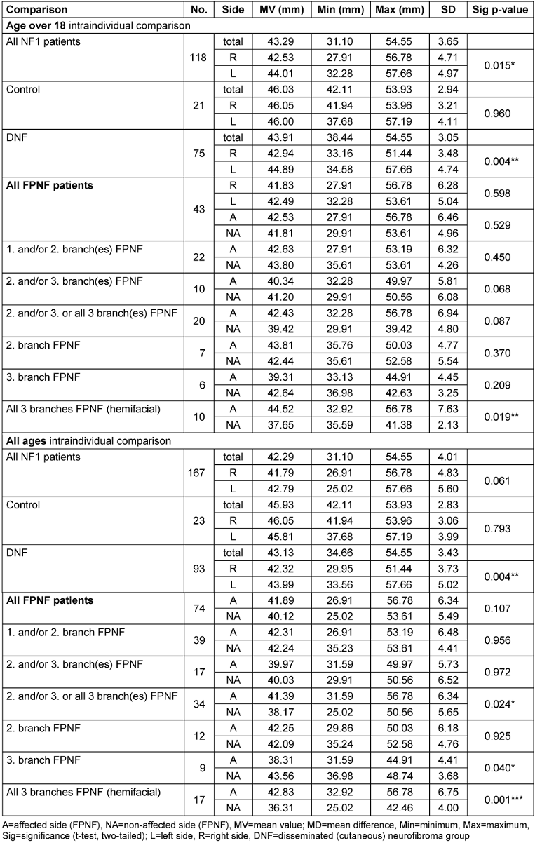 The vertical distance Ag-Z shows no differences in the comparison of the total groups if only individuals older than 18 years are included. In the intraindividual side comparison, a quantitatively small, statistically significant difference is demonstrated in the total group of NF1 patients: The distance is greater on the side where the tumor in PNF patients is located. This difference is confirmed in the side comparison of the FPNF subgroups. With the additional inclusion of individuals <18 years of age in the intraindividual comparisons, the statistically significantly longer distance of the affected side from Z-plane is confirmed. When analyzing the subgroups, this finding is an effect of the FPNF group (p=0.001). Within the FPNF group (all ages), the distance Ag-Z on the affected side is equal in size or greater. The findings reach statistically significantly different values only in the two groups with PNF of the 1st and/or 2nd, and 2nd and/or 3rd, trigeminal branch (Table 7 [Tab. 7]).