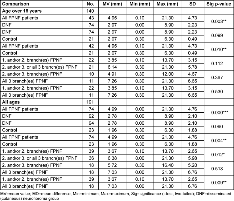 Then, the differences between the diagnosis groups were compared. In NF1 patients aged ≥18 years, the differences between the diagnostic subgroups hardly had any statistically significant effects. Statistically significant effects were registered when comparing FPNF patients (CoA minus CoNA) with manifestations in the 1st and/or 2nd trigeminal branch and those with hemifacial PNF. This result was confirmed when NF1 patients were included in the evaluation without age restriction.