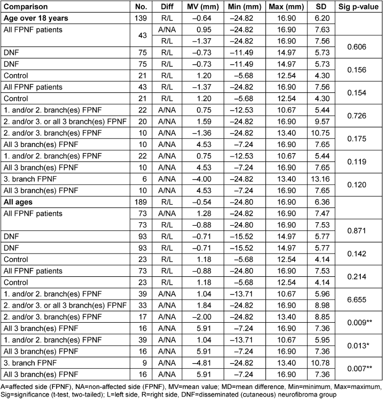 Table 3: Vertical distance of reference points ‘Condyle’ to Z-plane on posterior-anterior cephalogram in NF1 patients (all ages) with facial plexiform neurofibroma (FPNF). Mean comparisons of the bilaterally registered measured values within the diagnostic groups.