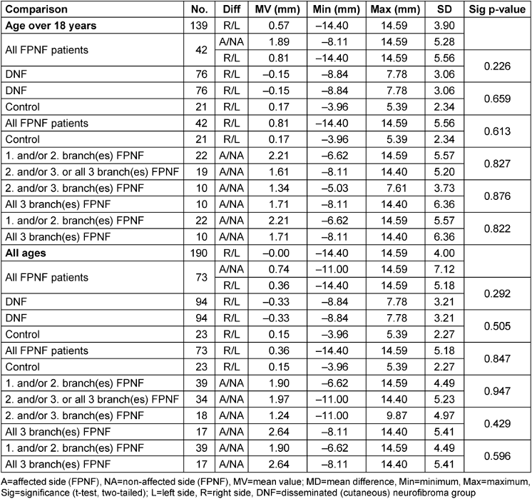 Difference A_NA is negative: The measuring point of side A (affected side) is closer to the M-plane than the measuring point of side NA (non-affected). The A/NA distinction was used for measurements of the FPNF group.