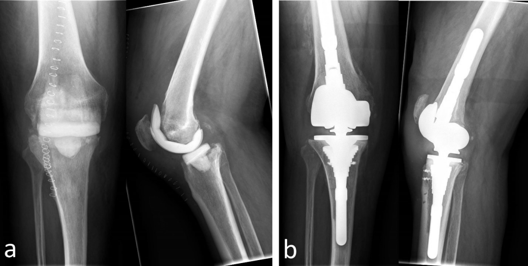 Figure 1: 62-year-old patient with TKR infection right. a) Radiograph of the knee anterior-posterior and lateral after implantation of a movable spacer (knee spacer AGC Style Company BiometOrthopedics Inc. Warsaw, U.S.A.). b) X-ray of knee anterior-posterior and lateral after re-implantation of revision-TKR (Typ LCS revision, Company DePuy Synthes, West Chester, PA, U.S.A.)