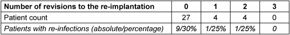 Table 3: Number of revisions to the re-implantation and number of re-infections based on the number of patients (absolute and percentage)