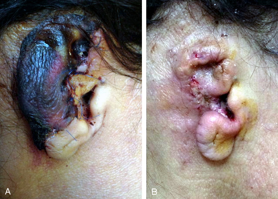 Also, Yoshimura and his colleagues described a combined postauricular skin flap and a mastoid fascial flap [11]. The two flaps were then used to sandwich a fabricated costal cartilage framework. The donor area for the mastoid fascial flap was skin grafted. The difference of this technique from that presented by Yotsuyanagi et al. was in using free rib cartilage graft instead of chondrocutaneous flap [10].