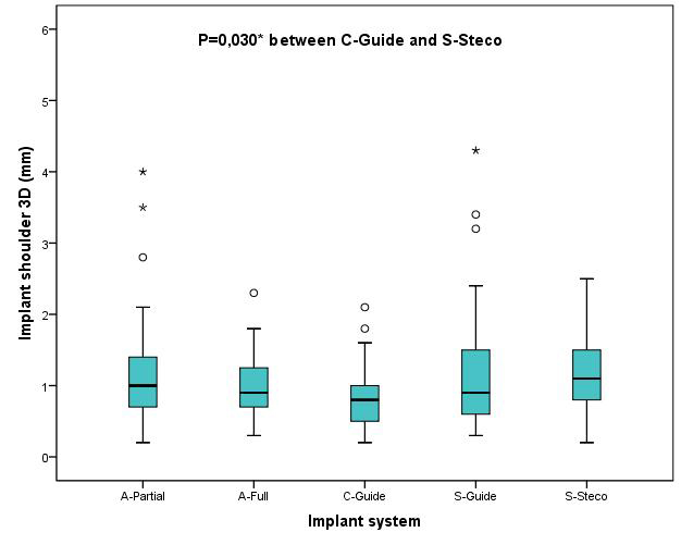 Figure 13: Boxplots of the different implant systems according to the 3D deviations at the implant shoulder in mm