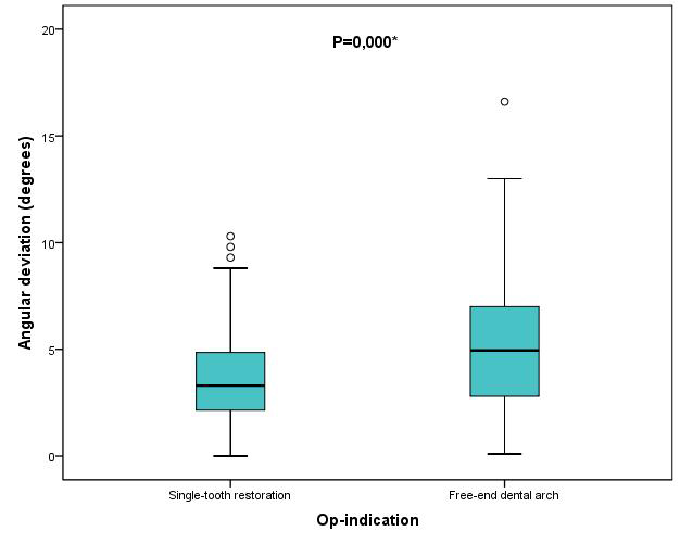 Figure 15: Boxplots of the different op-indications (single-tooth restoration or free-end dental arch) according to the angular deviations in degrees