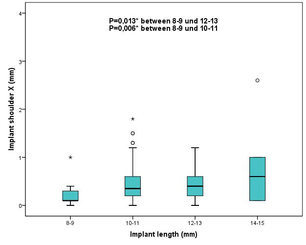 Figure 16: Boxplots of the different implant lengths 8–9 mm, 10–11 mm, 12–13 mm, 14–15 mm according to the deviations at the implant shoulder X (mesial-distal direction) in mm
