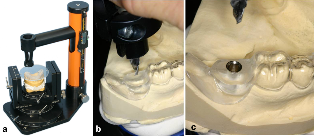 Following virtual implant planning and referencing, data were transferred to a dental laboratory. Based on virtual planning, drill guides were created using a gonyX table (IVS Solutions AG, Chemnitz, Germany) in the laboratory (Figure 7a-c [Fig. 7]).