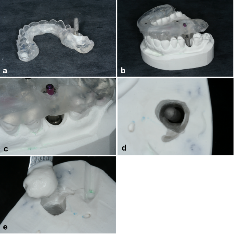 Figure 9: Transfer of the surgical results to the study cast a) The implant analogue was screwed onto the impression post. b) and c) The scan template with the impression post was inserted into the cast. d) The cast with the implant; e) The implant is getting fixed with plaster.