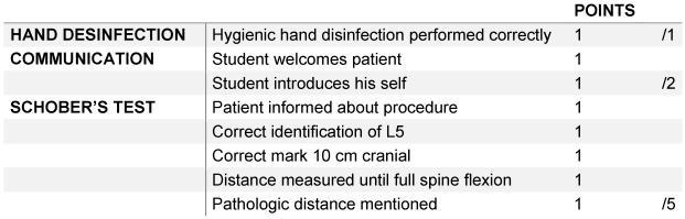 The skills, which the students have to demonstrate, are the testing of the range of motion in the thoracic und lumbar spine including the documentation by using of neutral null method including the Schober’s test and Ott’s sign. They also have to perform the Trendelenburg’s sign and examine the pelvic position. Simulation patients were employed. These simulation patients have medical background and get training on how to act during the examination. Most of them are tutors of the Skills-Lab Leipzig and some are medical students. To pass the exam the students had to accomplish at least 60% of the maximal points on the checklist.