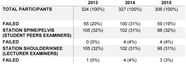 The results show a failing rate at the orthopedic station of 3% that might seem a bit low and could have many reasons. In our opinion, our standardized checklists and well-trained examiners help the students preparing and performing the exams and thus contribute to favorable results.