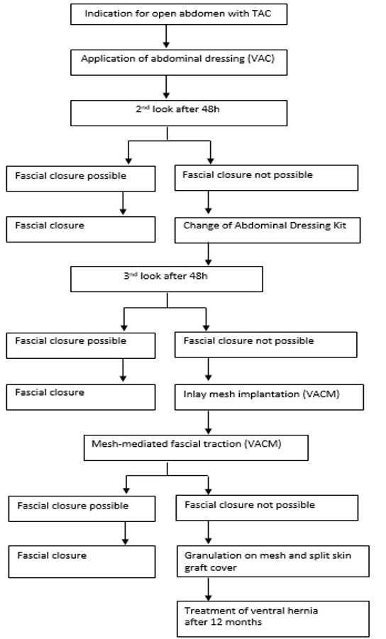 All patients were treated using a combined VAC/VACM therapy in accordance with a specified treatment manual (Figure 1 [Fig. 1]). Since there was an indication for TAC, a primary commercial V.A.C.® Abdominal-DressingTM (Kinetic Concepts Inc., USA) was applied. Planned surgical revisions were subsequently performed every 48 hours. In patients with clean intraabdominal conditions, the fascia was closed during the first surgical revision (second-look surgery). Where fascial closure could not be accomplished at that time, the Abdominal-DressinTM was changed. Where fascial closure could still not be achieved during the second surgical revision after application of the VAC dressing, polyglactin mesh (Ethicon, Germany) was sutured as inlay between the fascial edges (VACM) to prevent further retraction of the fascial edges. During the subsequent surgical revisions, intraabdominal access was achieved by incision of the polyglactin mesh along the median line to leave the fascial edges intact. At the end of surgery, the polyglactin mesh was closed by an overlapping suture along the median line in order to approximate the fascial edges and thus to reduce the laparostoma.