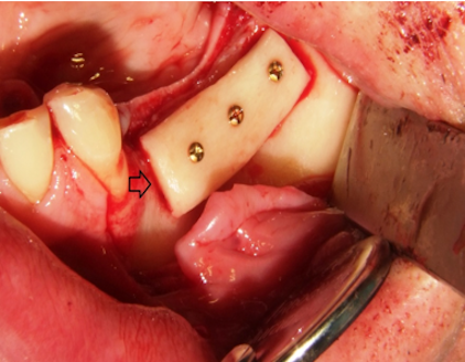 Figure 3: The bone graft is placed in the bone defect in the maxillary left posterior area and fixed with three titanium osteosynthesis screws (arrow).