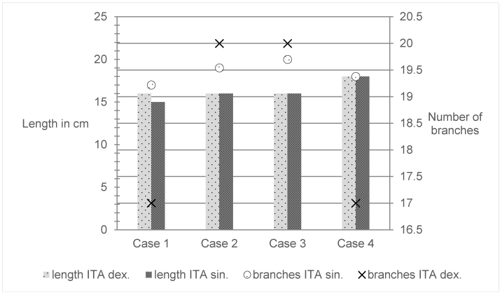 The aim of the macroscopic preparation was to obtain accurate information about the length, number, and region of the outgoing perforators. The test was carried out on two alcohol-fixed preparations and two preparations fixed using the Thiel method. There were no significant differences between the specimens. The length of the ITA, measured from the beginning of the first rib to the division into the superior epigastric artery and musculophrenic artery, was an average of 16.3 cm. On average, 18.5 branches were delivered from each artery, 10 medially to the sternum supply, and 8 to the intercostal muscle (Table 1 [Tab. 1] and Figure 4 [Fig. 4]).