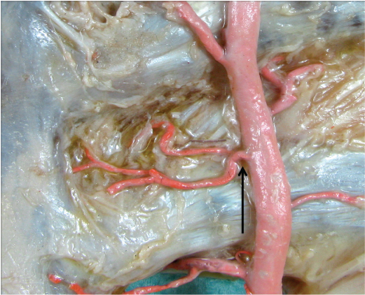 Figure 2: ITA and its branches of sternal and intramuscular branches (arrows: common trunk arborizing in sternal and intercostal branches)
