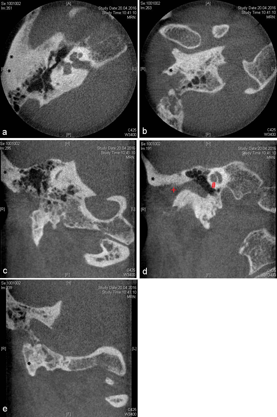 Figure 4: Preoperative cone beam computerized tomography (CBCT) imaging. a: Axial section. Black asterisk indicating planned cranial implant positions. b: Axial section. Black asterisk indicating planned caudal implant position. c: Coronal section. Black asterisk indicating planned first cranial implant position. d: Coronal section. Black asterisk indicating planned second cranial implant position, red plus marking the external meatus acusticus, and red diamond showing the cochlea. e: Coronal section. Black asterisk indicating planned caudal implant position.
