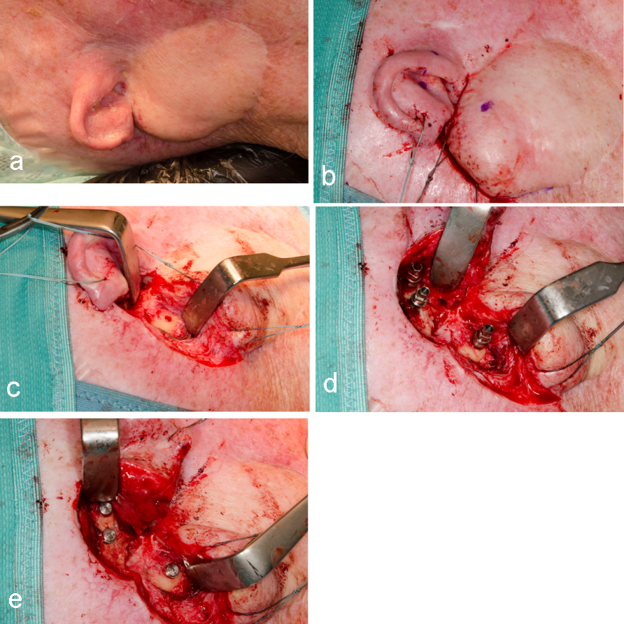 The authors would like to thank PD Dr. M. Herzog (Department of Laryngo-Rhino-Otology, Head and Neck Surgery, University Hospital Halle, Germany; since recently, at Carl-Thiem Hospital Cottbus, Department of Laryngo-Rhino-Otology, Head and Neck Surgery, Germany) for performing the lateral mastoidectomy, and Sylvia Dehnbostel (Institute for Anaplastology, Celle, Germany) for manufacturing the epithesis. In addition, we acknowledge Dr. Gabrielle Cremer Consulting (https://cremerconsulting.com) for providing English language editing.