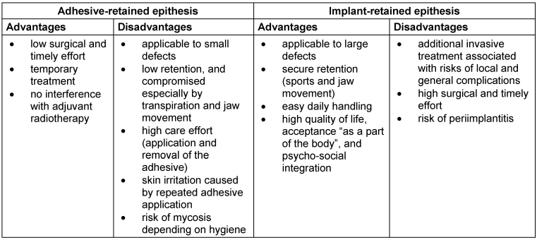 Table 2: Comparison of the adhesive-retained vs. implant-retained epitheses (modified according to [13])