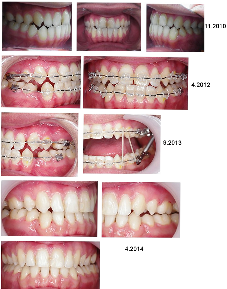 Figure 3: Photographic documentation of the change in position of teeth and jaw during orthodontic-surgical therapy.