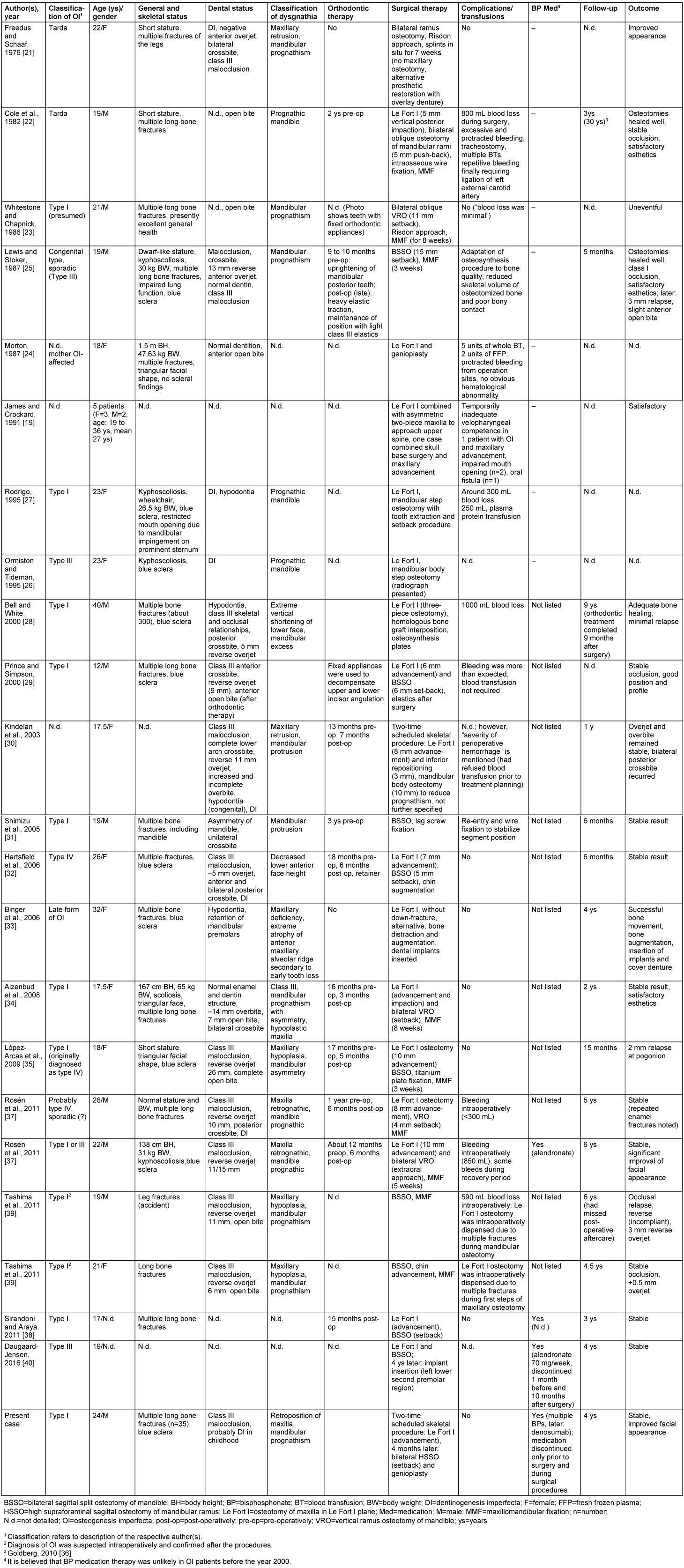 Table 4: Literature review on orthognathic surgery in patients with osteogenesis imperfecta