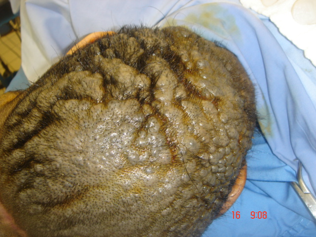 Figure 2: Picture shows the involvement of a pigmented and corrugated nevus on the scalp.