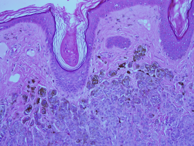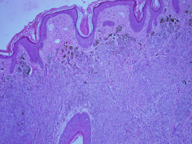 Figure 9: High-power view shows intact dermo-epidermal junction with pigmented melanocytic nests in the superficial part of the nevus.