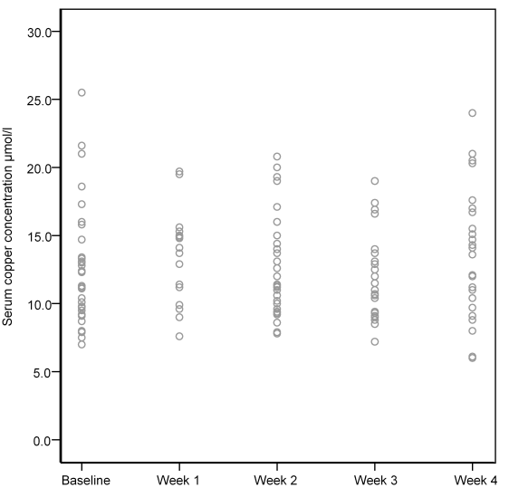 Figure 2: Scatterplot of copper concentrations during four weeks after admission (normal limits 11–22 µmol/l).