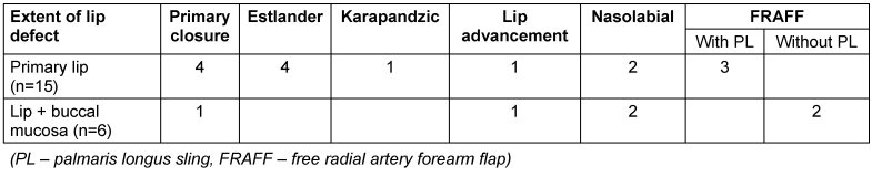 Ergebnisse: Bei den 21 Patienten wurden 5 Rekonstruktionen mit freiem Radialis-Unterarmlappen, 4 Rekonstruktionen mit Nasolabiallappen, 5 primäre Defektverschlüsse, 4 Rekonstruktionen mit Estlander-Lappen, 2 Lippenvorschübe und 1 Rekonstruktion mit Karapandzic-Lappen durchgeführt. Bei freiem Lappen und Nasolabiallappen traten Hypästhesie und Funktionseinschränkung auf, wenn die Kommissur rekonstruiert wurde, und das Problem der Größe, der eingeschränkten Mobilität und der Rot-Fehlanpassung. Lokale Lappen und Lippenlappen waren mit einer verringerten Stomagröße und einer Form von lokaler Narbenbildung und Asymmetrie verbunden. Alle Patienten waren jedoch mit dem funktionellen und ästhetischen Ergebnis zufrieden.