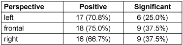 When looking at the data of the true skin age as well as the eight single skin criteria, then in 71.2% of the comparisons between timepoint 1 and 2 there was a better result at timepoint 2, whereas the opposite was true in 28.8% of the cases. This result was obtained by calculation of 73 comparisons from the true skin age and the eight criteria from all three angles of capture for the 19 volunteers. 25 out of the 73 comparisons were calculated as statistically significant (p<0.05). These were all positive with the conditions at timepoint 2 being better than at timepoint 1. For the left perspective, 17 out of 24 comparisons were positive (70.8%) and 6 out of 24 were statistically significant, for the front perspective 18 out of 24 were positive and 9 significant, and for the right perspective 16 out of 24 were positive and 9 significant (Table 1 [Tab. 1]).