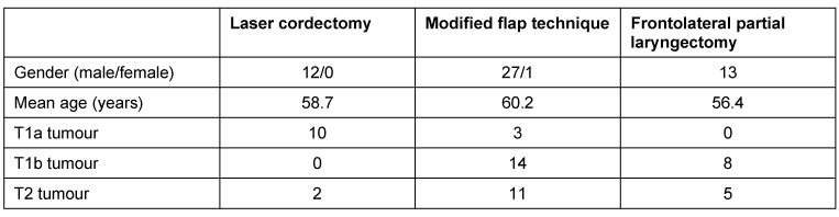 The study included 28 patients (median age: 60.2 years; tumour stage: T1a=3, T1b=14, T2=11) who underwent the modified flap technique (MFT), 13 patients (median age: 56.4 years; tumour stage: T1b=8, T2=5) who underwent conventional frontolateral partial laryngectomy (FLPL) as described by Conley, and 12 patients (median age: 58.7 years; tumour stage: T1a=10, T2=2) who underwent transoral laser cordectomy (LC) (Table 1 [Tab. 1]). All patients gave written informed consent to the study. The authors assert that all procedures contributing to this work comply with the ethical standards of the relevant national and institutional guidelines on human experimentation (Ethikkommission Universität Ulm) and with the Helsinki Declaration of 1975, as revised in 2008.