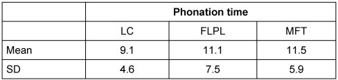 Table 4: Maximum phonation times in seconds. Patients were asked to phonate the vowel “a” three times. The averaged results are presented in the table. (LC = laser cordectomy, FLPL = frontolateral partial laryngectomy, MFT = modified flap technique, SD = standard deviation)