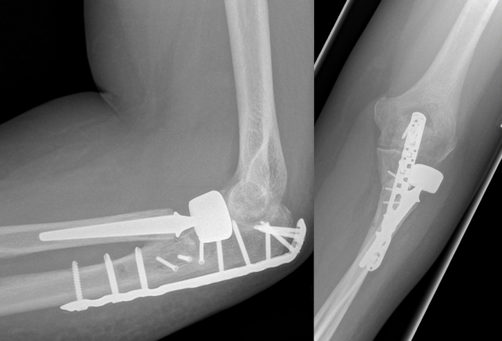 Figure 2: Postoperative radiographs. Osteosynthesis of the ulna was performed using a proximally precontoured olecranon plate applied to the posterior surface of the ulna. Implantation of a cemented bipolar radial head prosthesis.