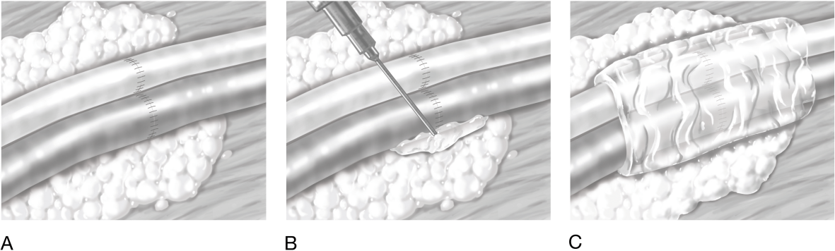 There are other methods to protect a vascular pedicle, e.g., placing adipose tissue fragments or muscle beside it [17]. This technique of cushioning tissues can be very efficaciously combined with the use of fibrin glue. Fibrin glue is an excellent tool for filling deep spaces, e.g., at the site of the internal mammaria artery (IMA) or tibial posterior artery anastomoses. As microsurgeons know from breast reconstruction using the IMA, placing the microvessels along a rib is often necessary. To prevent the rib from disturbing the IMA as well as, fibrin glue is used as a distance-maintaining cushion.