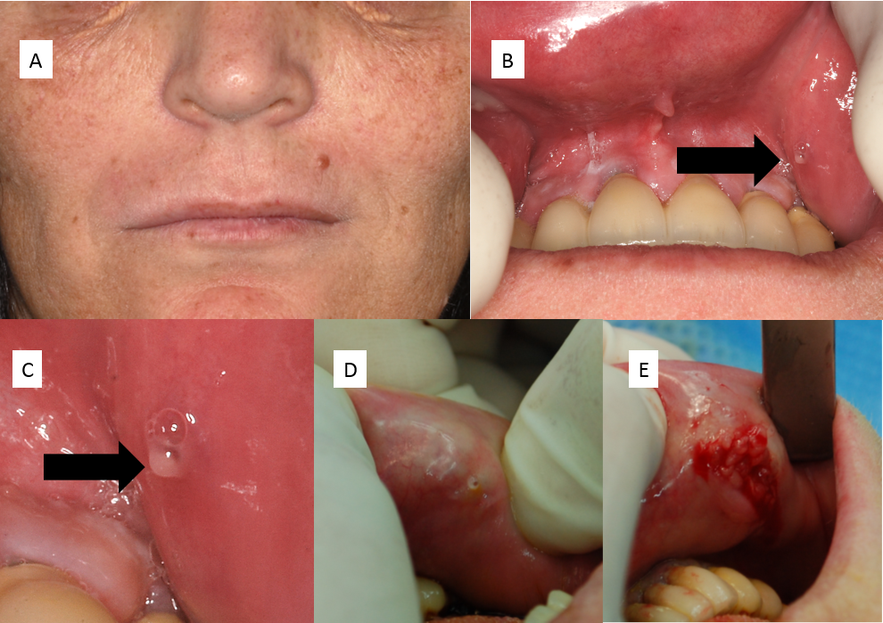 Figure 1: (A) Detail of patient’s photograph en face showing multiple pigmentary disorders of her light skin. The lips also show pigmentary disorders but the lip contour is not affected. The disease cannot be estimated from the external evaluation. (B) Oral inspection reveals clear mucous drooling after light compression of the upper lip (C) Close-up view of the oral aspect shown in (B) reveals the extended orifice of the labial minor salivary gland. (D) Expulsion of clear saliva after slight pressure on the lower lip from minor salivary glands of the lower lip vermilion during oral investigation for recurrent cheilitis glandularis. (E) After incision of the lower lip, berry-like enlarged minor salivary glands come to light.
