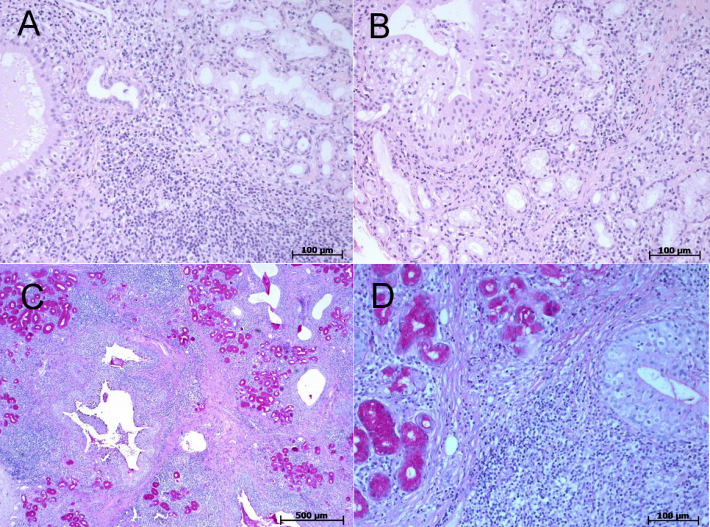 Figure 2: (A) Minor salivary gland with interstitial lymphoid infiltrates penetrating atrophic acinar residues; excretory ducts (left) showing moderate ectasia and mucous retention. (B) Closer look at the duct system showing epithelial hyperplasia and apocrine metaplasia (A and B: haematoxylin-eosin staining). (C) Low magnification of the ectatic ductal tree and the irregular atrophia of acinar tissues with some fibrosis and lymphoid infiltrates in between. (D) Closer look at the lymphoid infiltrates penetrating the hyperplastic ductal epithelium (C and D: periodic acid-Schiff reaction).