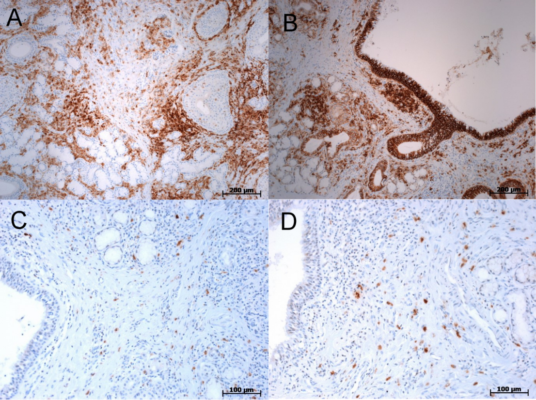 Figure 3: Immunohistochemical decoration of the interstitial lymphoid infiltrate (A: CD45, B: CD138). IgG4 staining showing a scattered pattern in (C), and very focal clustering in (D).