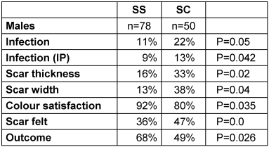 17% of the SS group had unsatisfactory scar thickness as compared to 28% in the SC group (p=0.041), 30% in the SS group noticed a widened scar compared with 45% in the SC group (p=0.019). Only 38% of the SS group could feel the scar as compared with 51% of the SC group (p=0.040). The majority of patients in the SS group (59%) noticed that their scar matched the skin colour, as compared to 45% of the SC group (p=0.042).