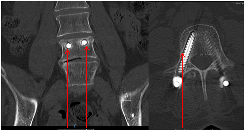 Figure 4: FFP 4b type fracture. The red arrows show the malposition of the sacroiliac screws anterior to the ala. The short red line shows the course of the L5 nerve. The conflict between the screws and the nerves is obviously.