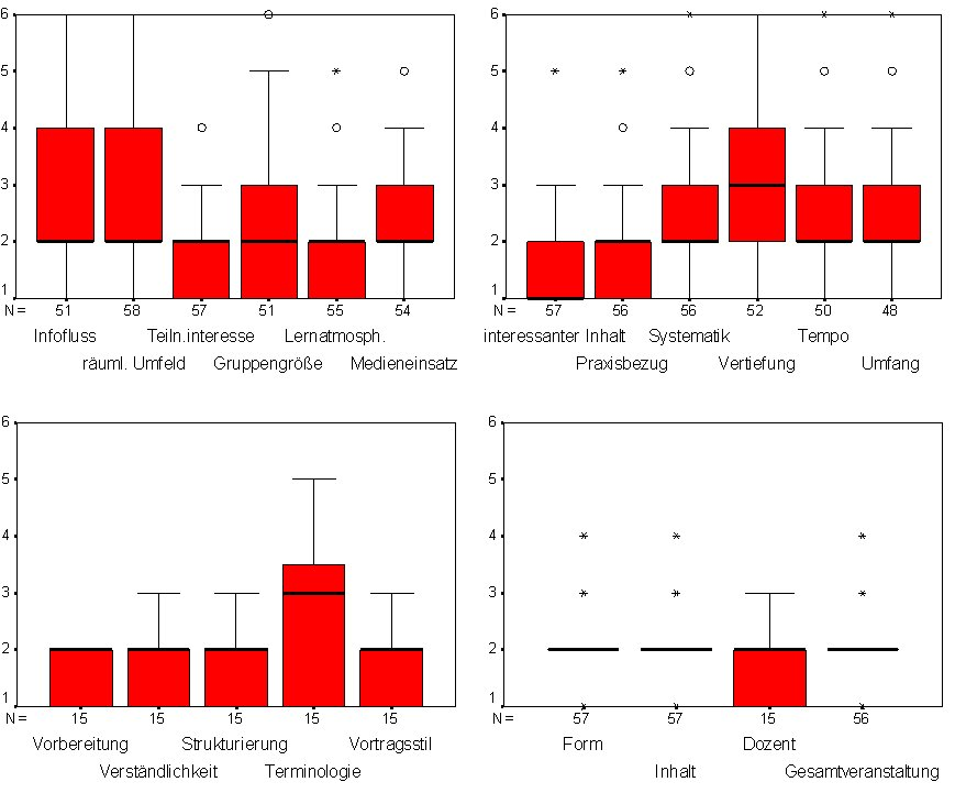 Wegen der F?lle der Daten beschr?nkt sich nachfolgende Darstellung auf die Vorlesungen und Seminare (Ergebnisse zum Psychiatrischen Praktikum siehe Barkmann et al [20]). Zu Beginn wird die Beurteilung aus Sicht der Studierenden pr?sentiert, dann die Studierenden- und Dozentenurteile einander gegen?bergestellt. Abschlie?end wird die Umsetzung der Ergebnisse skizziert. Die Bewertungsachsen aller Abbildungen werden wegen der besseren ?bersichtlichkeit einheitlich als Schulnotenskala dargestellt.
