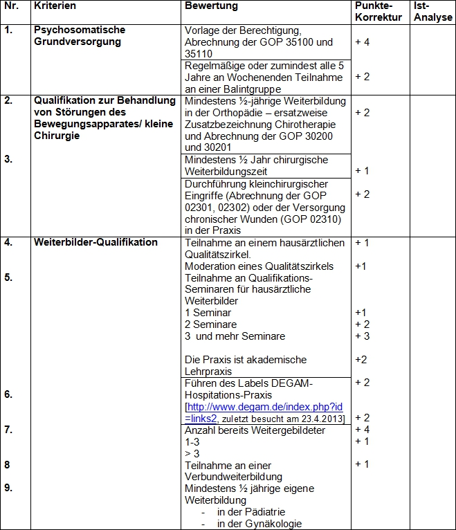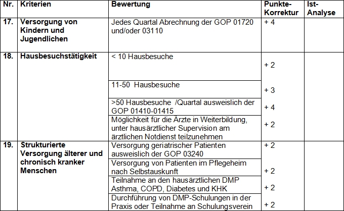 Neben wenigen „Ausschluss-Kriterien“ (zu geringe Patientenzahl, keine Durchführung von Hausbesuchen) ist der Katalog in die Bereiche