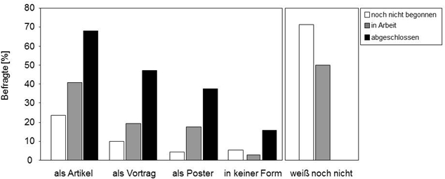 Als Maß für den wissenschaftlichen Erkenntnisgewinn gilt die Publikation. Aus diesem Grunde wurde abgefragt, ob die Ergebnisse der eigenen Promotion veröffentlicht werden bzw. wurden und wenn ja, in welcher Form. Wie anzunehmen, können die Studierenden im Vorfeld nur Erwartungen äußern. 71,4% geben an, es noch nicht zu wissen. Dieser Prozentsatz sinkt während der Promotion auf 52,0%. Tatsächlich aber haben nur 15,1% derjenigen mit einer abgeschlossenen Promotion ihre Ergebnisse gar nicht veröffentlicht. Dem gegenüber stehen 67,9% mit (mindestens) einem Artikel, 47,2%, die (mindestens) einen Vortrag gehalten und 37,7%, die (mindestens) ein Poster präsentiert haben (siehe Abbildung 2 [Abb. 2]). Angaben über die jeweiligen Autorenpositionen der Doktoranden liegen nicht vor. Auffällig ist, dass die bestehenden Erwartungen bezüglich der Publikation eigener Daten vor Beginn der Promotion niedrig sind, in der Gruppe der Promovierenden zunehmen und von den tatsächlichen Ergebnissen der bereits promovierten Gruppe übertroffen werden. Diese Beobachtung gilt nicht nur für veröffentlichte Artikel, sondern auch für Vorträge und Poster.