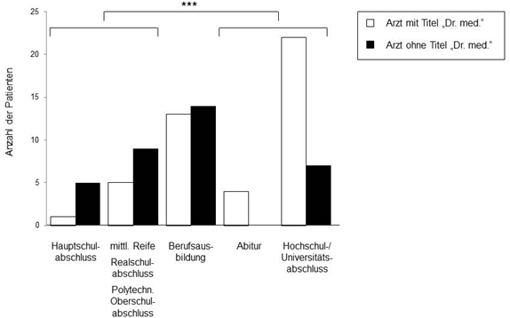 Abschließend haben wir die Einstellung von Patienten gegenüber einem promovierten Hausarzt in Abhängigkeit vom jeweiligen Bildungsniveau der Patienten analysiert. Dazu haben wir vier Praxen von niedergelassenen Hausärzten – zwei im Besitz und zwei ohne akademischen Titel – ausgewählt und konsekutiv 83 Patienten mittels Fragebogen nach ihrem Alter, Geschlecht, Bildungsstand und Stellenwert des „Dr. med.“ bei ihrem behandelnden Arzt befragt. Tatsächlich wählen die Patienten mit einem höheren Bildungsstand (Abitur/allgemeine Hochschulreife und Hochschul-/Universitätsabschluss) einen Arzt, der den Titel „Dr. med.“ trägt (p=0,0005, RR=0,3778, 95% CI=0,1893-0,7541). Patienten, deren Bildungsstand in die gewählten Kategorien nicht eindeutig einzuordnen war („Berufsausbildung“, „Sonstiges“), wurden in diese Berechnung nicht miteinbezogen. Abbildung 4 [Abb. 4] fasst das Ergebnis eines Fisher’s Exact Tests zusammen und zeigt, dass Patienten mit einem höheren Bildungsstand einen promovierten Arzt bevorzugen.