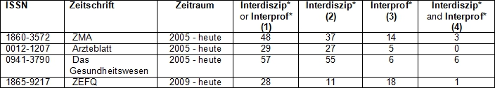 Die Suche nach den Begrifflichkeiten „interprof*“ und „interdiszip*“, als die am häufigsten scheinbar synonym verwendeten Begrifflichkeiten, ergab die folgende Trefferzahl je Zeitschrift (siehe Tabelle 1 [Tab. 1]).
