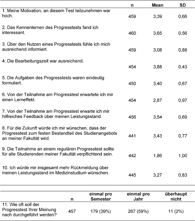 Die Evaluation des formativen kompetenzorientierten Progresstests wurde seitens der MERLIN-Projektpartner der Medizinischen Fakultät Freiburg im „Kompetenzzentrum Evaluation in der Medizin Baden-Württemberg“ der Universität Freiburg entwickelt. Alle Studierenden beantworteten direkt nach der Durchführung des Progresstests einen kurzen Fragebogen mit 11 Fragen zum Progresstest.