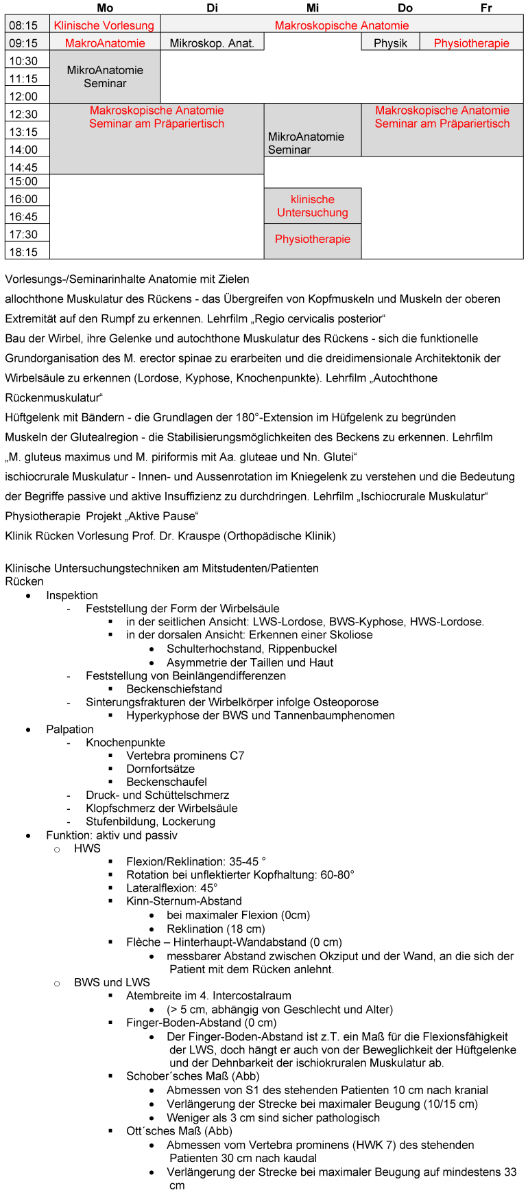 Die Untersuchung des gesunden Bewegungsapparates wird bereits im 1. Studienjahr vermittelt. Im Block „Der Mensch-Fokus Bewegung“ wird die makroskopische Anatomie des Menschen theoretisch und praktisch (Präparierkurs) an die Studierenden herangetragen. Dabei werden physikalische Grundbegriffe integrativ erläutert und durch eine enge Kooperation mit der Physiotherapieschule frühzeitig physikalische Therapiekonzepte den Studierenden in praktischen Übungen vorgestellt. Schulter, Hand, Knie, Rücken und Fuß bilden Themenschwerpunkte, die in einer Woche interdisziplinär und interprofessionell behandelt werden (siehe Abbildung 1 [Abb. 1]). Inhalte der praktischen Erfahrung sind dabei die Erkennung des Normalen, der Variabilität des Normalen aber auch erste Abweichungen vom Normalen, z.B. Fehlhaltung des Rückens, Beckenschiefstand, etc.. Orthopäden und Unfallchirurgen erklären häufige und typische Verletzungen, die auf physikalischen Grundlagen basieren und die Anatomie besser verstehen lassen. Gleichzeitig werden Konzepte zum Erhalt des gesunden Bewegungsapparates vorgestellt (Rückentraining, Training zur Stabilisierung der Knie, …). Hierzu konnten erfahrene Physiotherapeuten und renommierte Trainer (z.B. eines ortsansässigen deutschen Leistungszentrums) gewonnen werden (siehe Abbildung 1 [Abb. 1]).